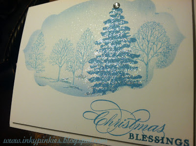 I tried this card in both 1 and 2 layers. I like them both, but I like the card front popped up for a little dimension. It's simply masked with a 4-1/4" x 5-1/2" layer of paper die cut with Apothecary Accents Framelits. I used scotch tape to hold the template in place, and if you use regular weight cardstock, it's reusable several times. Then either use one color of ink, and stamp off the smaller trees once to make them lighter, or use 2 coordinating ink colors. Sponge the edges of the die cut window, lightly, inward, in a circular motion. Stamp the "Silent Night" word tree from Evergreen in Frost White Shimmer Paint, applied with a sponge. Before removing the die cut window, spritz a little shimmer mist over the whole scene (I created my own with a spray mini mister mixed with 2/3 rubbing alcohol & a few drops of Shimmer Paint). It makes your snowy scene look fantastic! Stamp your sentiment (Many Merry Messages) with either your 2 colors, or stamp, stamp off, and recolor "Blessings" with the same color Stampin' Write Marker. At this point, if you are layering the card, trim your panel down 1/8" on each side and adhere with dimensionals. Stamp inside sentiment. When your card is fully assembled, draw a little Crystal Effects onto the scene at the base of the trees and sprinkle with Dazzling Diamonds. This simple card will shine like crazy!